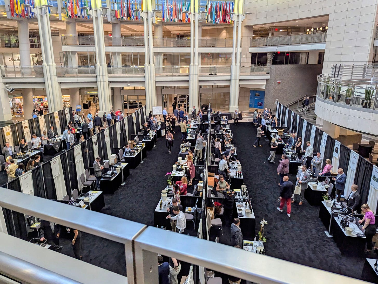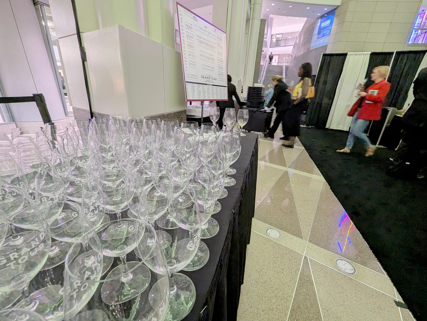 Standing in the mezzanine, overlooking the Wine Spectator’s Grand Tour setup down in the Atrium in Washington, D.C.’s Ronald Reagan Building, six precise rows of booths are tucked tightly into a grand wedge, looking like compartments in an enormous jewelry box. There are two identical auditoriums packed with similar hardware on either side.